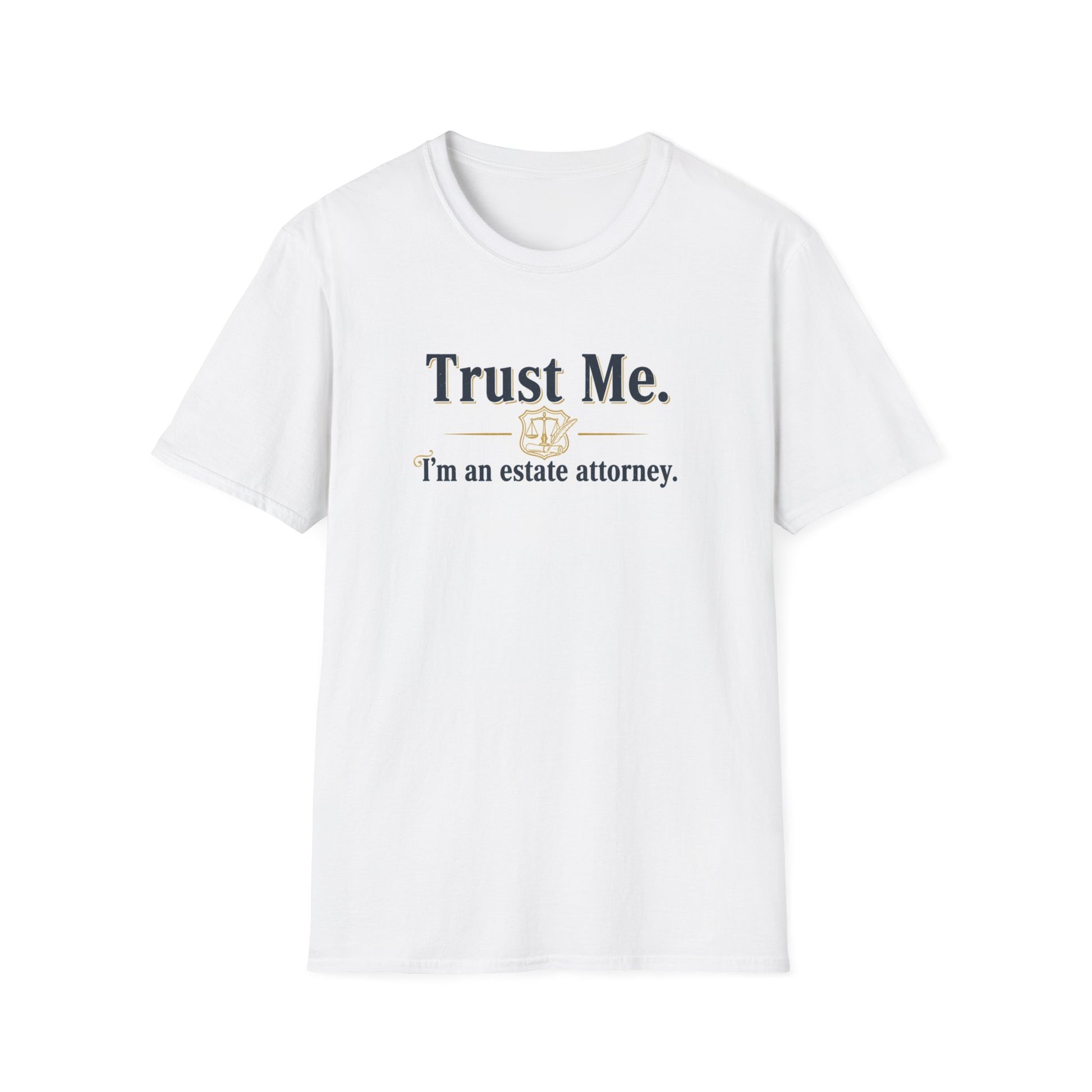 Soft, confident, and quietly humorous—this crewneck tee speaks to professionals who balance seriousness with a wink. The front features a clean, serif headline “Trust Me.” with a subtle gavel graphic and smaller text beneath: “I’m an estate attorney.” Lightweight and smooth, the shirt drapes cleanly for a composed look that works under a blazer or on its own at casual firm events. It wears comfortably during long days at the office, client visits, or weekend study sessions, and the restrained design keeps the tone professional while letting personality peek through. Finished with a tear-away label and stabilized shoulders, it stays neat after repeated wear and washes. For attorneys who want low-key humor and reliable quality, this tee fits into the wardrobe without shouting—just the right balance of polish and personality.